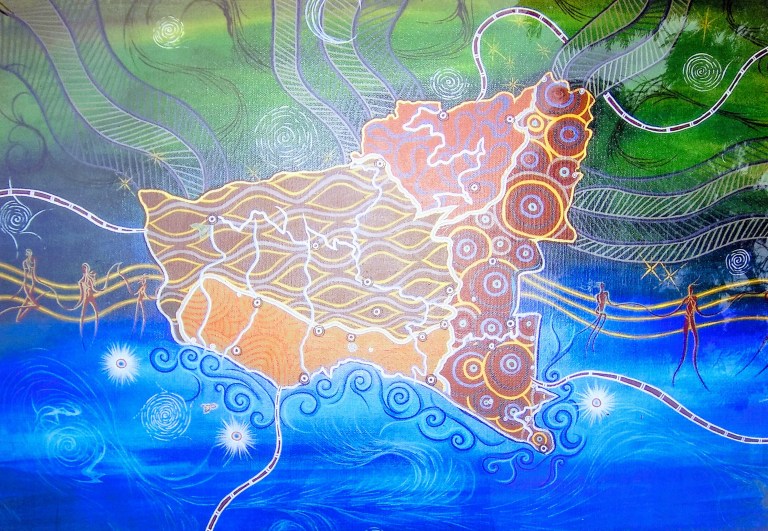 Zoals je ziet was het allemaal wel mooi om te zien, maar niet echt uitnodigend om erbij te gaan liggen met een goed boek. De laatste foto van de kunst die je hier ziet is gemaakt door Aboriginals. Het is een kaart van Australië. Ik vind het kleurgebruik heel erg gaaf.