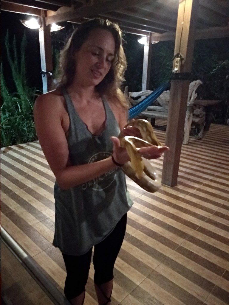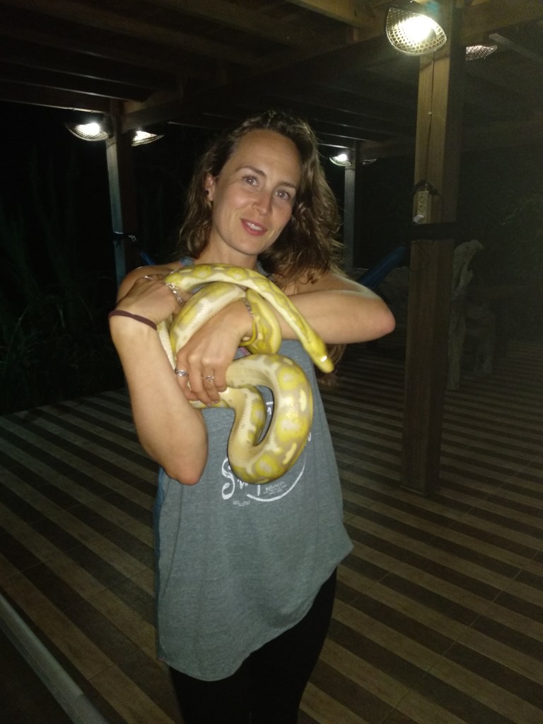 Mijn eerste avond in Bukit Lawang was ik ook hier. SUMECO is op dit moment bij de oprichter thuis: Bobi. Heel zijn hart heeft hij op de dieren en natuurbehoud gericht. Hij is een slangenexpert en toevallig hadden ze eerder die week een gele python uit gevangenschap gered. Wat een mooi beest!