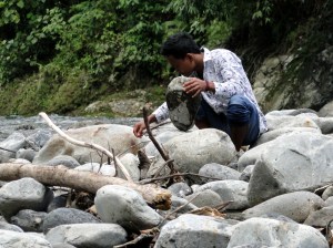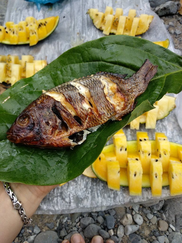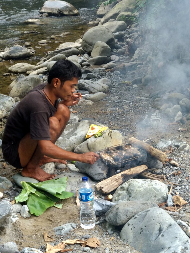 Soms na het werk of in het weekend lopen we een stuk verder langs de rivier de jungle in. Dan nemen we vaak een ‘tube’ mee om terug te raften na bijvoorbeeld een barbecue met verse vis en fruit. Op de foto’s hieronder zie je één van de goed gelukte barbecues met Ingan en Jeri (ook één van mijn beste vrienden hier) en twee toeristen Andi en Latitia. Het is ongelofelijk hoe de jungleboys met bijna niets een feestmaal weten te bereiden!