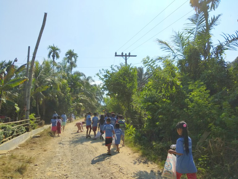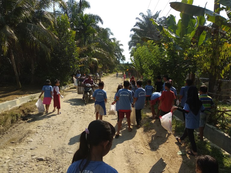 Eén keer in de drie weken zijn er speciale lessen en activiteiten rondom natuurbescherming. Soms organiseren we jungle-trekkings, soms gaan we naar Erna’s farm waar ze leren over traditionele planten, kruiden enz. en soms doen we ‘rubbish picking’. Zo gingen we laatst naar een dorp verderop: Kendit. We gingen in jungle-style wat betekent: op het dak van het busje zitten mét muziek. Op de foto hieronder zie je hoe de kinderen dat ook altijd doen…IMG_20190129_110331