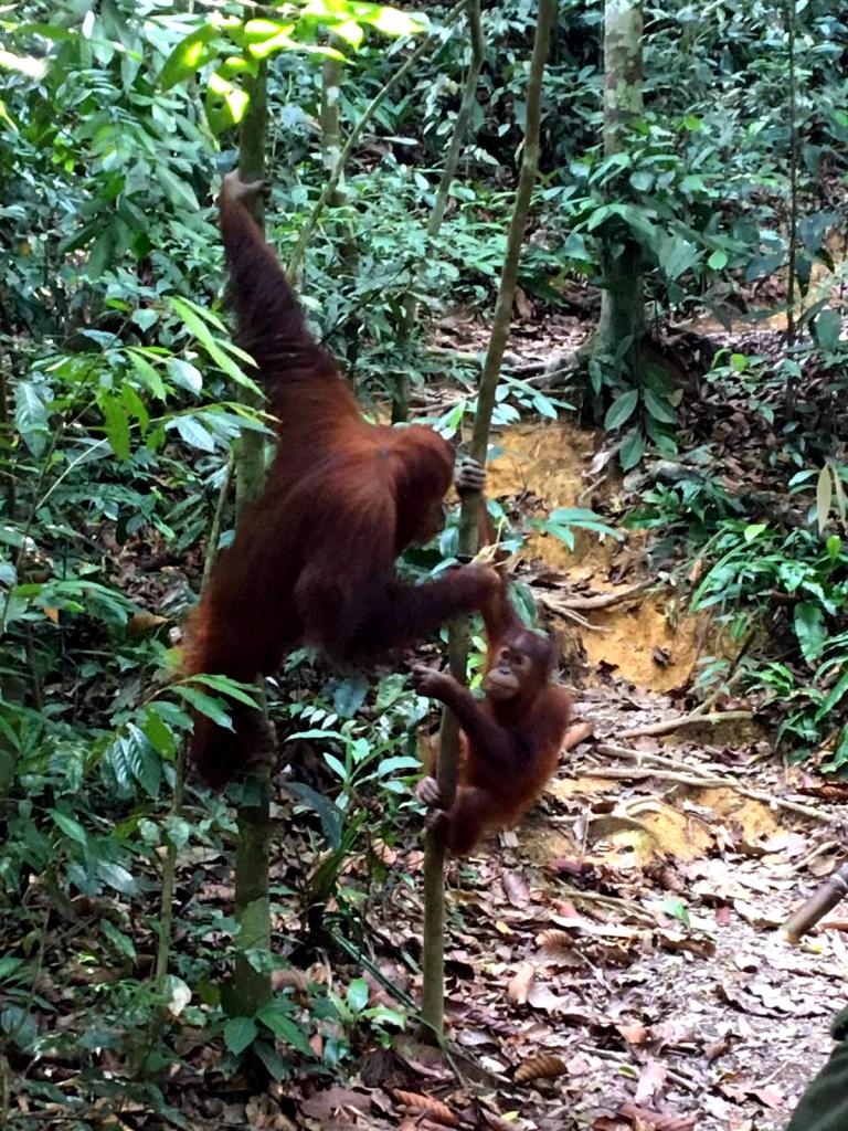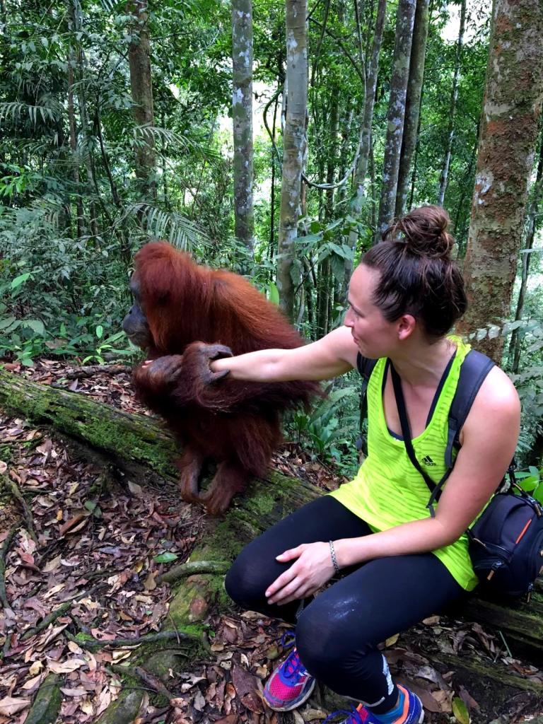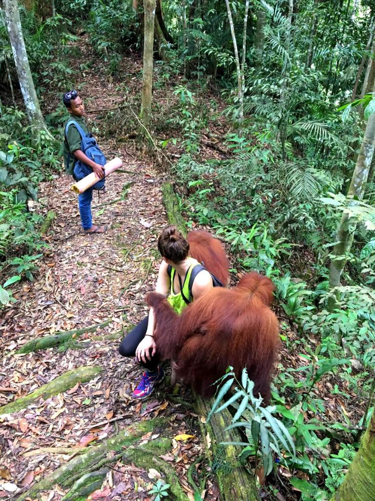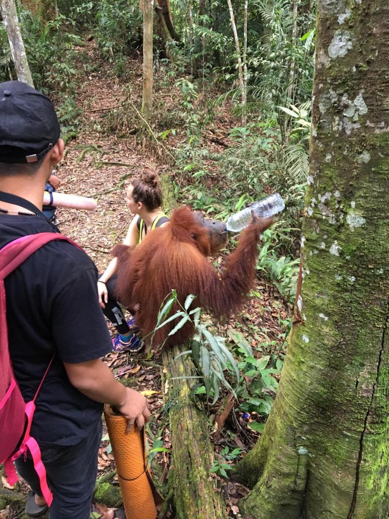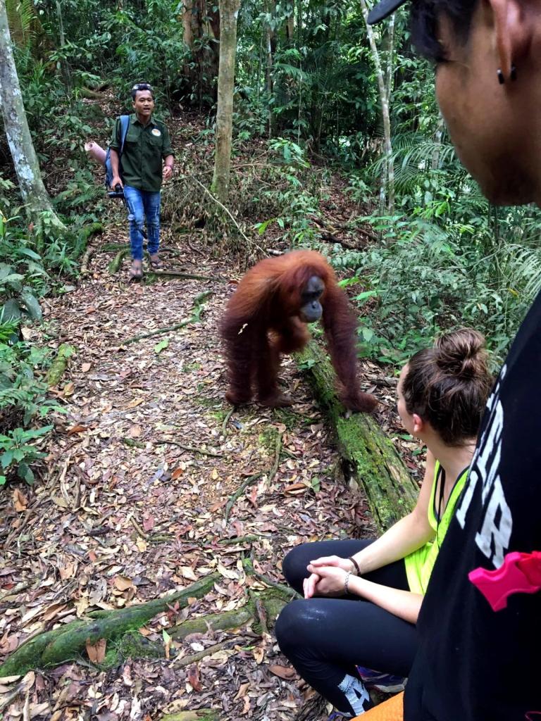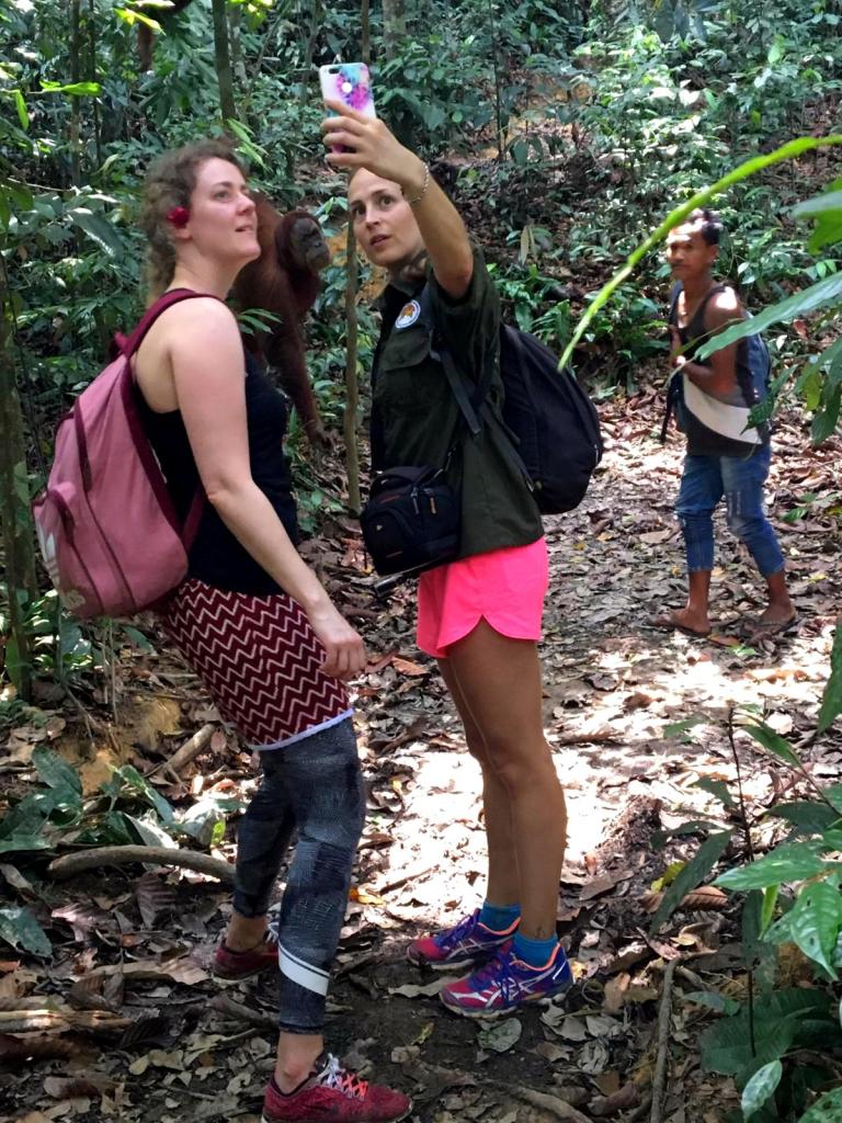 En toen stond ons weer net zo iets bijzonders te gebeuren als de dag ervoor: we ontmoetten een speciale Orang-oetan die luistert naar de naam: “Jackie the friendly one“. Ook zij is van de generatie die heeft meegemaakt dat mensen eten geven. Maar in tegenstelling tot Mina is zij vriendelijk naar mensen toe.