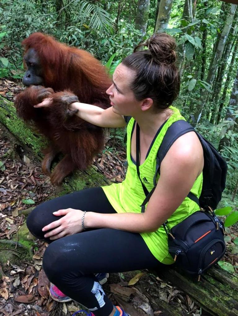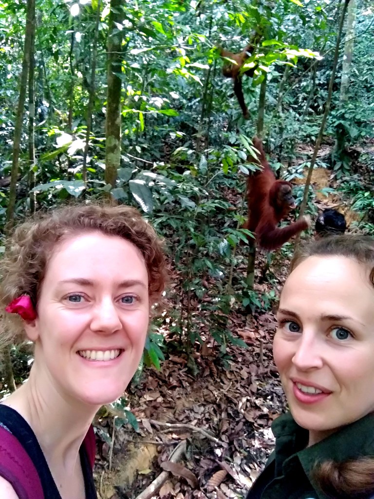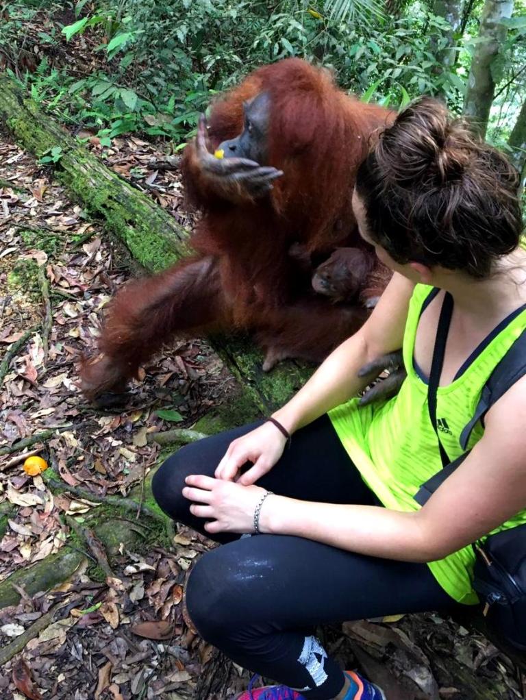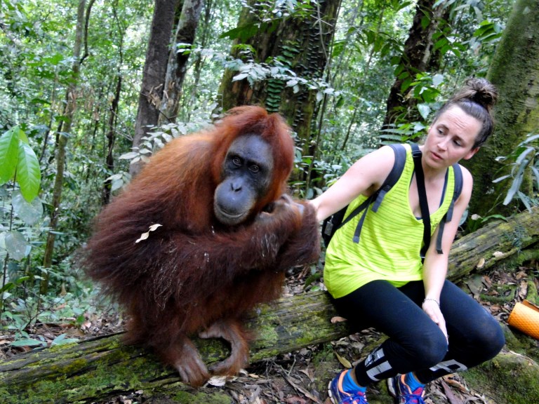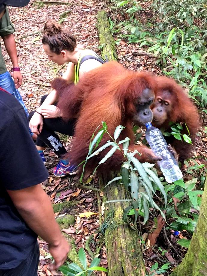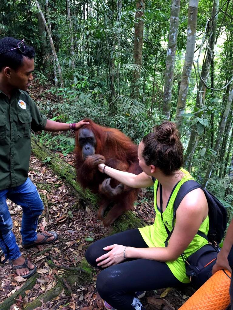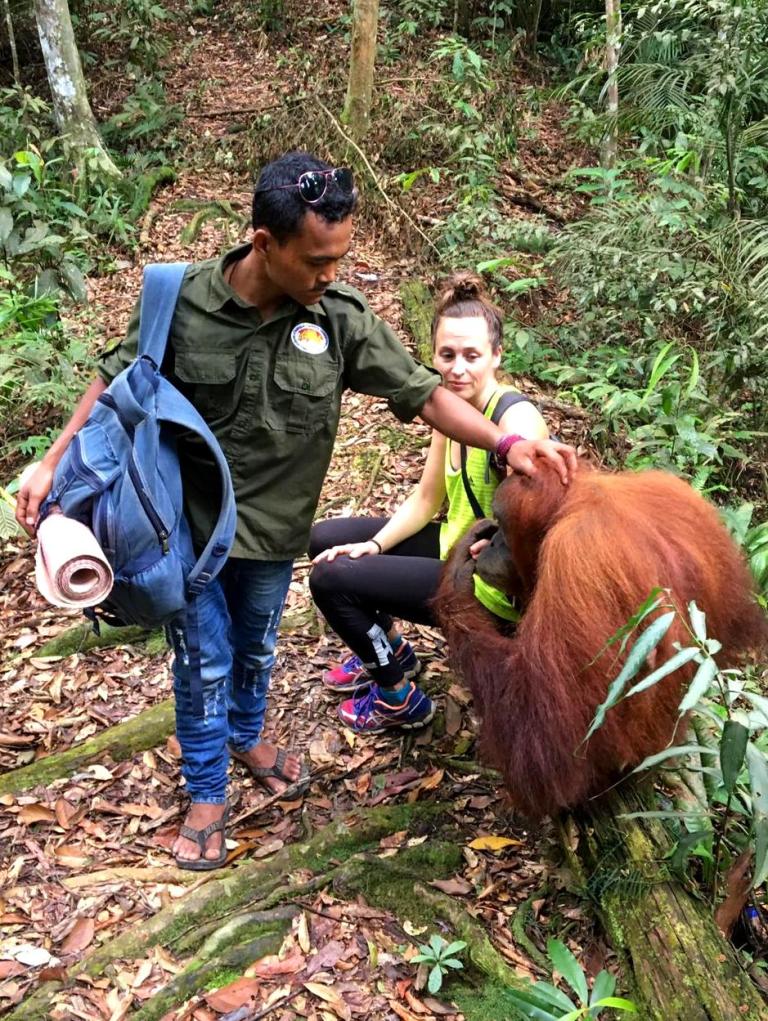 En toen stond ons weer net zo iets bijzonders te gebeuren als de dag ervoor: we ontmoetten een speciale Orang-oetan die luistert naar de naam: “Jackie the friendly one“. Ook zij is van de generatie die heeft meegemaakt dat mensen eten geven. Maar in tegenstelling tot Mina is zij vriendelijk naar mensen toe.