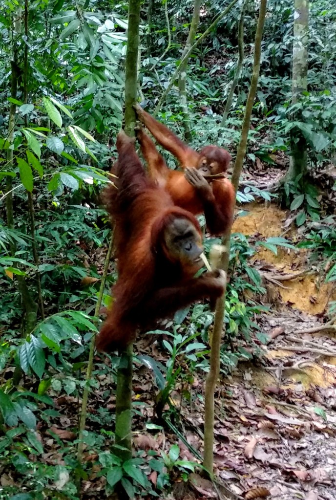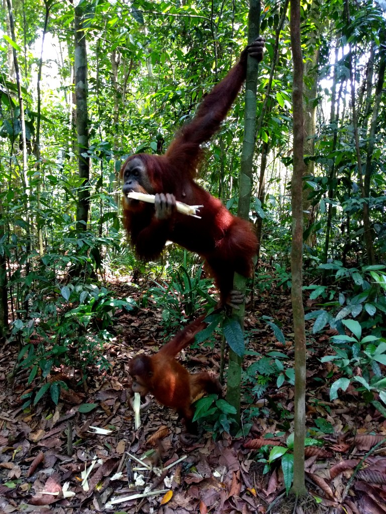 Het gedrag van Orang-oetans vind ik indrukwekkend om te observeren. Ze zijn voor 97% hetzelfde als mensen en dat zie je terug in hoe ze handelen, reageren en met elkaar omgaan. Wat ik altijd extra opvallend vind, is hoe de kinderen hun moeder imiteren. Je kunt zien op de foto’s hieronder hoe ‘the child of Mina’ constant dezelfde houding aanneemt bijvoorbeeld. En natuurlijk om eten vraagt.