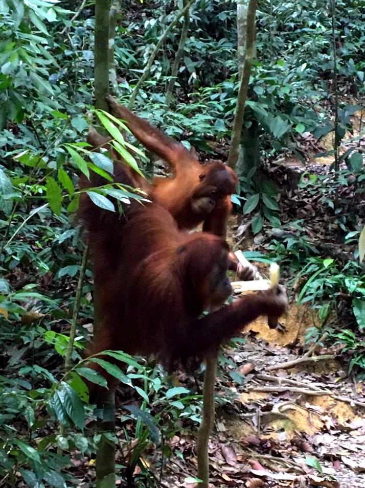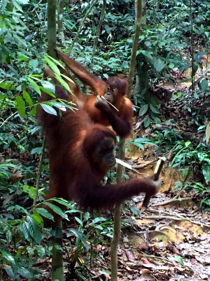 Er zijn een paar oudere Orang-oetans die dat nog hebben meegemaakt en heel goed weten dat mensen eten bij zich hebben. Eén Orang-oetan in het bijzonder is berucht in Bukit Lawang: Mina. Zodra zij mensen ziet, verwacht ze eten. Het is verboden de dieren te voeren, maar als je Mina niks geeft, wordt ze agressief. Ze komt heel dichtbij mensen en heeft al meerdere gidsen gebeten. Haar drie kinderen nemen het gedrag (helaas maar logischerwijs) over en haar zoontje is ondertussen een brutale aap geworden. Hij steelt graag de tassen van mensen. Bij wijze van uitzondering – als het echt niet anders kan – geven de gidsen een beetje fruit aan Mina.