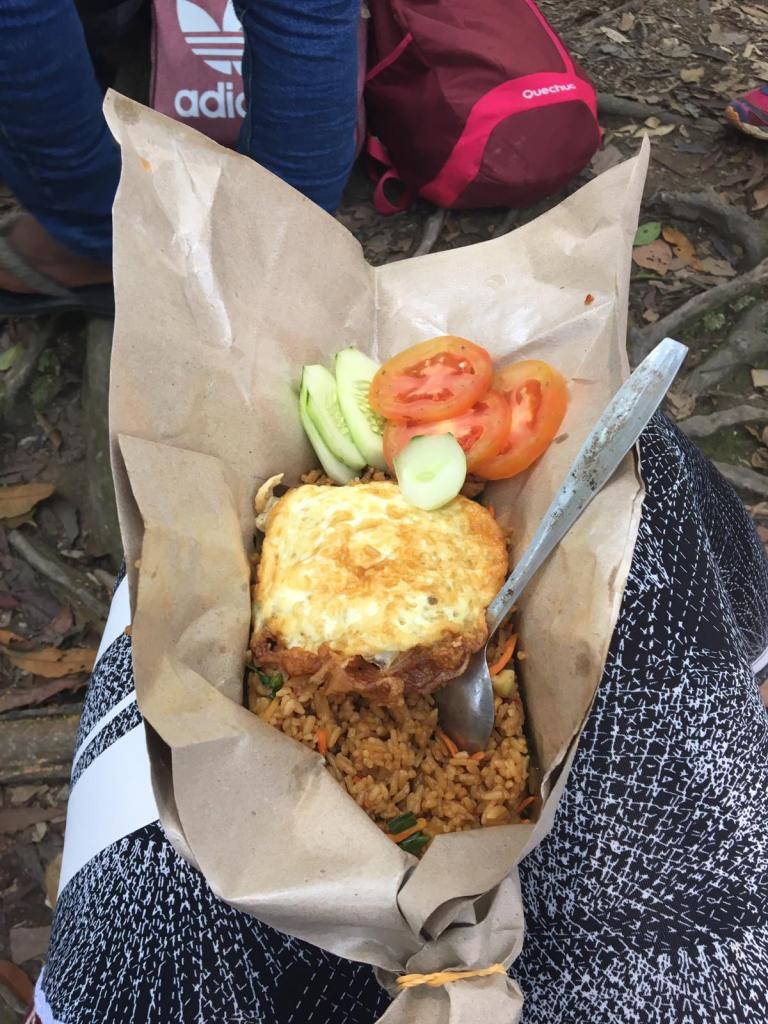 Na tien minuten lopen en vluchten voor Mina, was het tijd voor onze lunchpauze. Nasi Goreng stond op het menu wat nooit verkeerd is! Terwijl we aan het smikkelen waren, keek Edi opeens om omdat hij iets in de bomen vlakbij hoorde en zag dat Mina er aan kwam. Ze was ons toch gevolgd! Dan is het inpakken en wegwezen geblazen. In alle haast (zonder paniek en onverwachte bewegingen te maken), wist Mina de Nasi Goreng van Edi te pakken…
