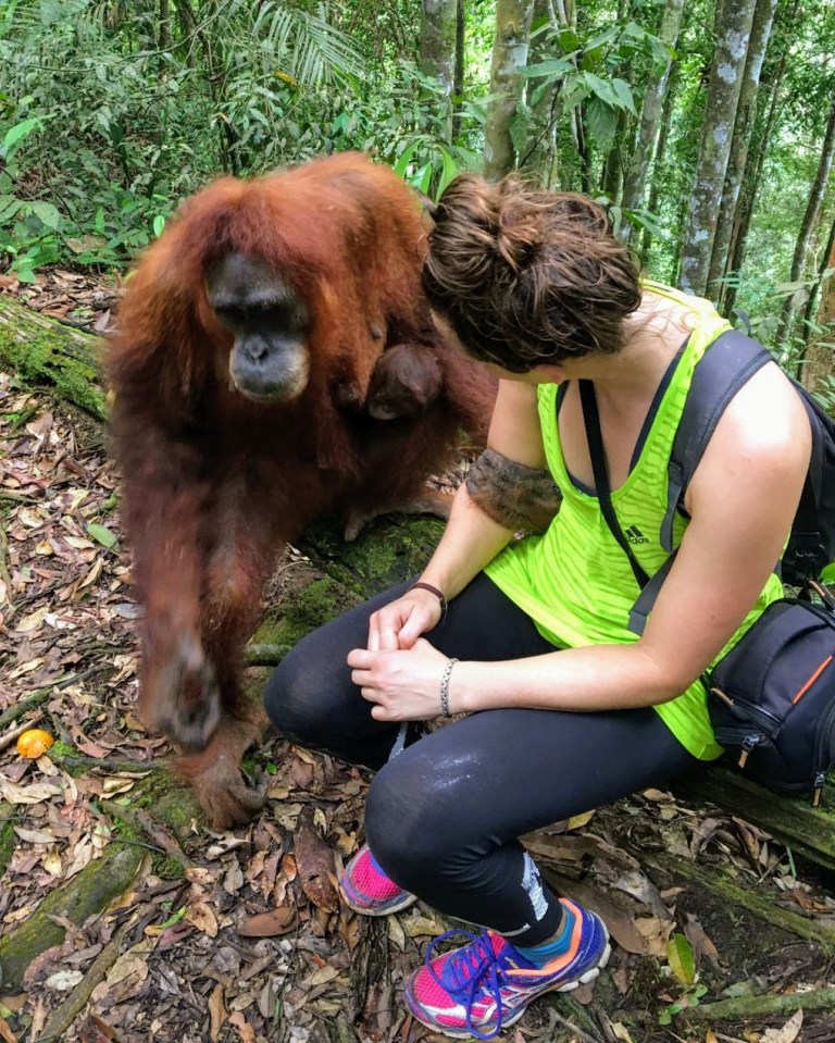 Terwijl Jackie naar beneden klom, zei Edi: “Anna, wat er ook gebeurt, ga maar gewoon rustig zitten en blijf rustig zitten. Ze komt soms heel dichtbij mensen zitten maar ze bijt nooit“. Denise had haar portie Orang-oetan wel gehad en bleef samen met Jeri op een afstandje toekijken. Jackie kwam regelrecht op me aflopen, ging naast me zitten en pakte mijn arm vast. Niet hard, maar je voelt wel direct dat ze heel sterk zijn en dat zij bepaalt wanneer ze los laat.