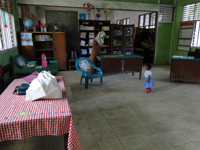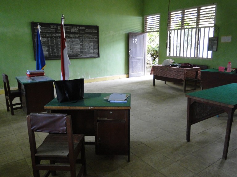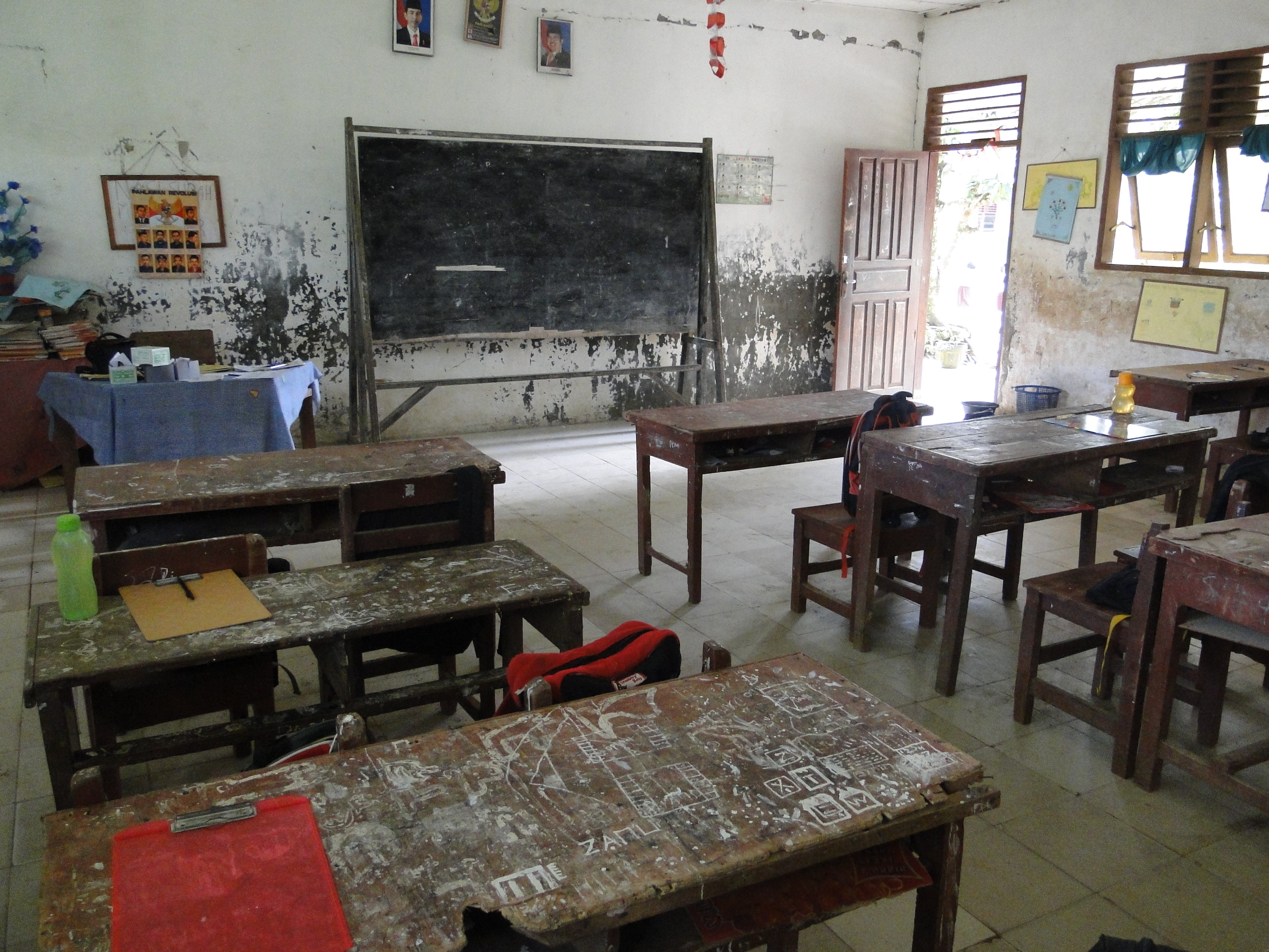 Ik ben een dag met Tri meegegaan naar de basisschool waar zij lesgeeft in de ochtend. (Kinderen gaan van ma t/m za naar school, van 8.30 uur tot zo’n 12.00 uur). Het is een verschrikking om te zien hoe erbarmelijk de staat van een school is. Het begon met de personeelskamer wat tegelijkertijd kantoor is van de directie.
