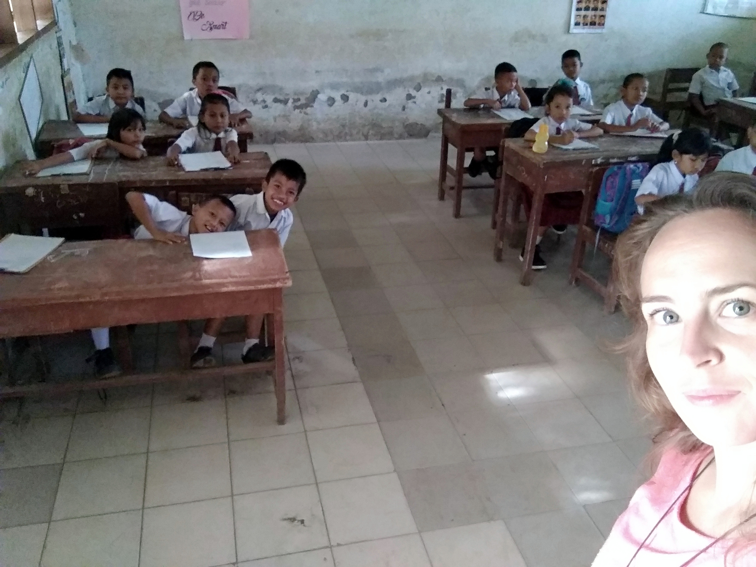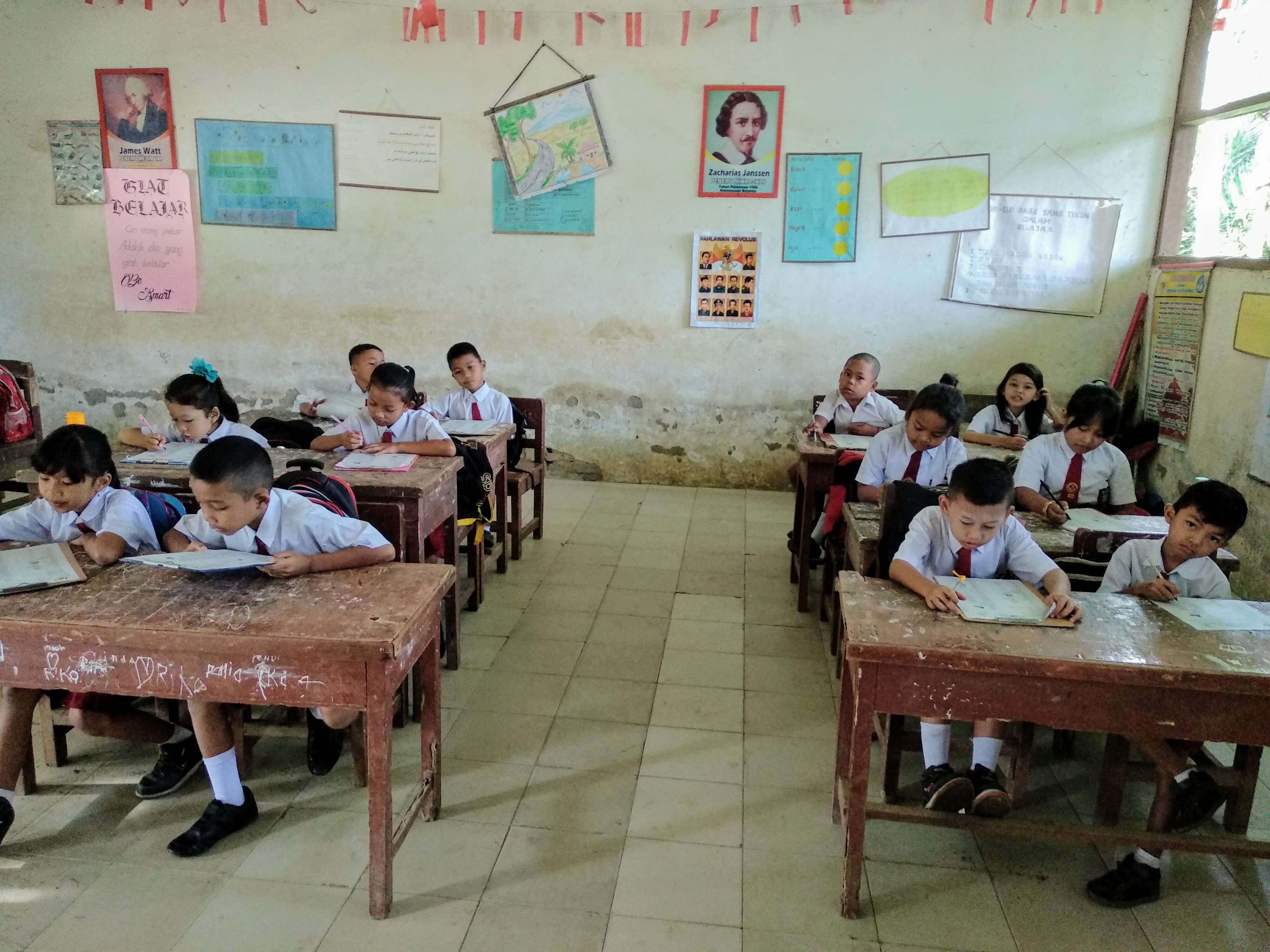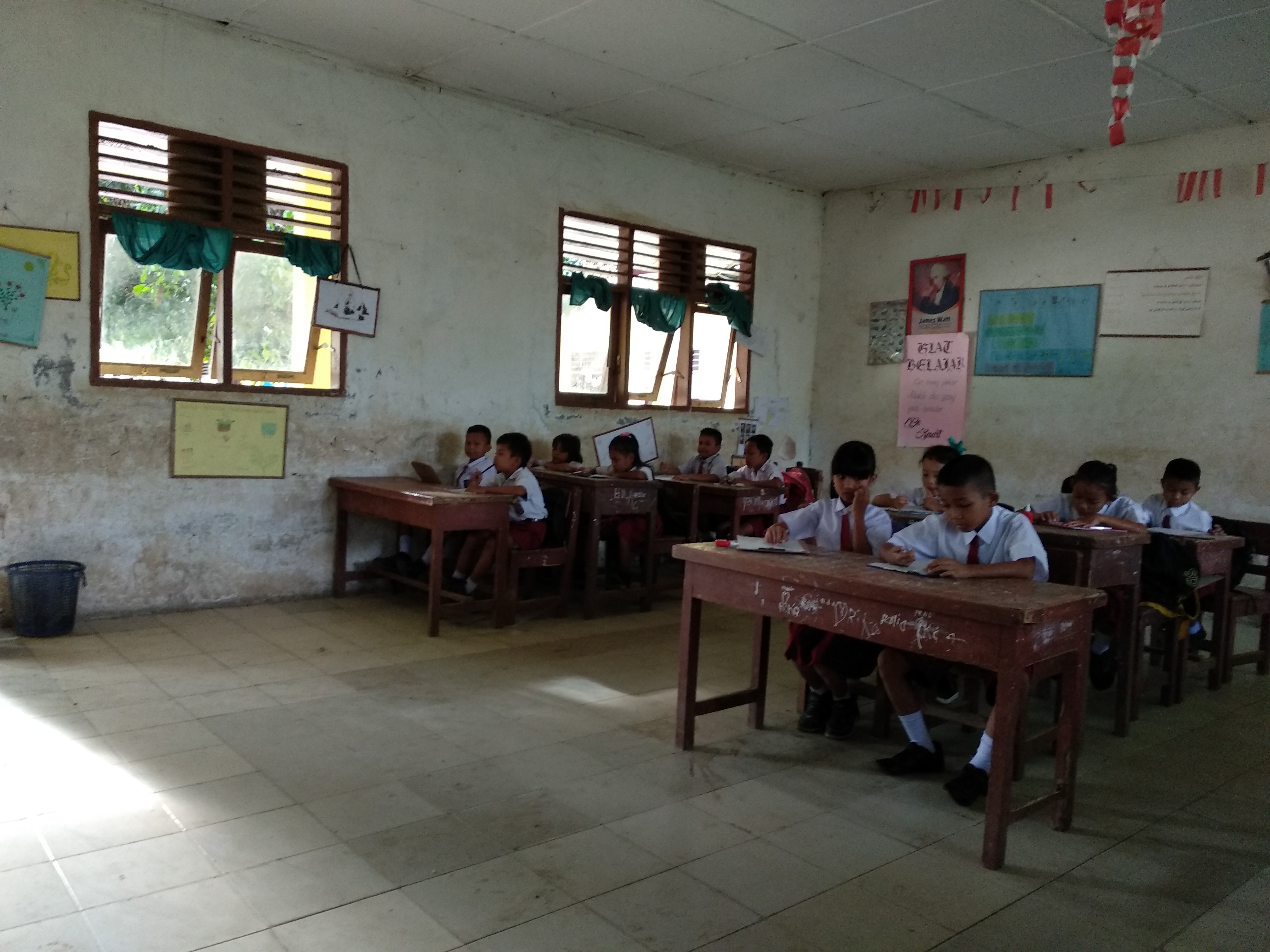 Ik ging mee met Tri om twee redenen: ik wilde een deel van mijn donatie aan haar school geven en vanzelfsprekend een dagje meekijken. Maar zoals altijd in Indonesië ging niks zoals gepland. Na het dagelijkse begin op het ‘schoolplein’ wat bestaat uit groeten en het volkslied zingen, ging ieder kind naar de eigen klas.