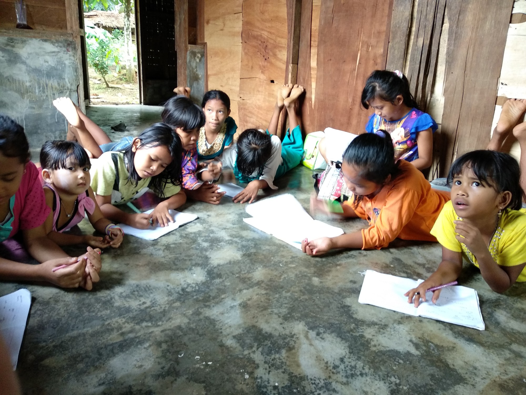 Met de scooter rij je vervolgens off road door een palmolie plantage om uit te komen bij een paar huisjes waarvan eentje leeg staat: de derde plek om les te geven. Feit dat er niemand meer woont, geeft wel een beetje aan in wat voor staat het huis verkeert. Maar dat mag de leerpret niet drukken! Ook hier trof ik een groep gemotiveerde kinderen aan!
