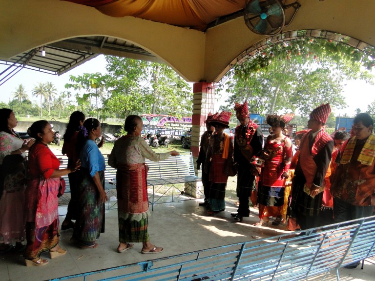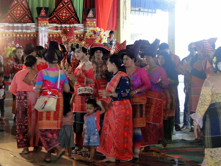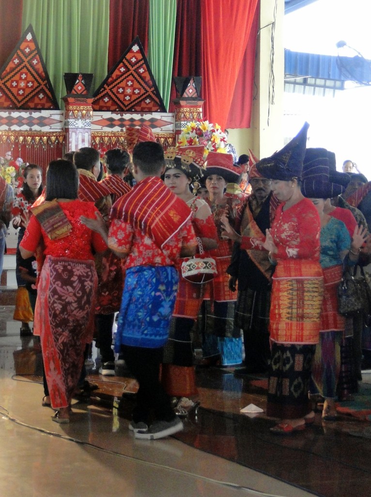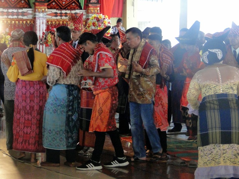 Iedereen was al vol in de make-up en vandaag waren de mannen en vrouwen in klederdracht. Er werden familiefoto’s gemaakt en alle gasten werden door de familie persoonlijk welkom geheten. De familie vroeg of ik bij ze wilden komen staan en zitten. Ik voelde me wel heel speciaal hierdoor. Daniël en Ingan legden uit dat ik nu bij de familie hoorde, met als familienaam: Brunangin.