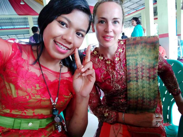 Daarna was het tijd voor de nette kleding. Het bruidspaar was ondertussen al aangekomen (wat totaal geen bijzonder moment was: ze kwamen gewoon aanlopen en gingen op hun troon zitten) en in de openluchtkeuken werd het avondeten al klaargemaakt. Ik had al snel nieuwe vrienden gemaakt in mijn Karonese outfit 😉