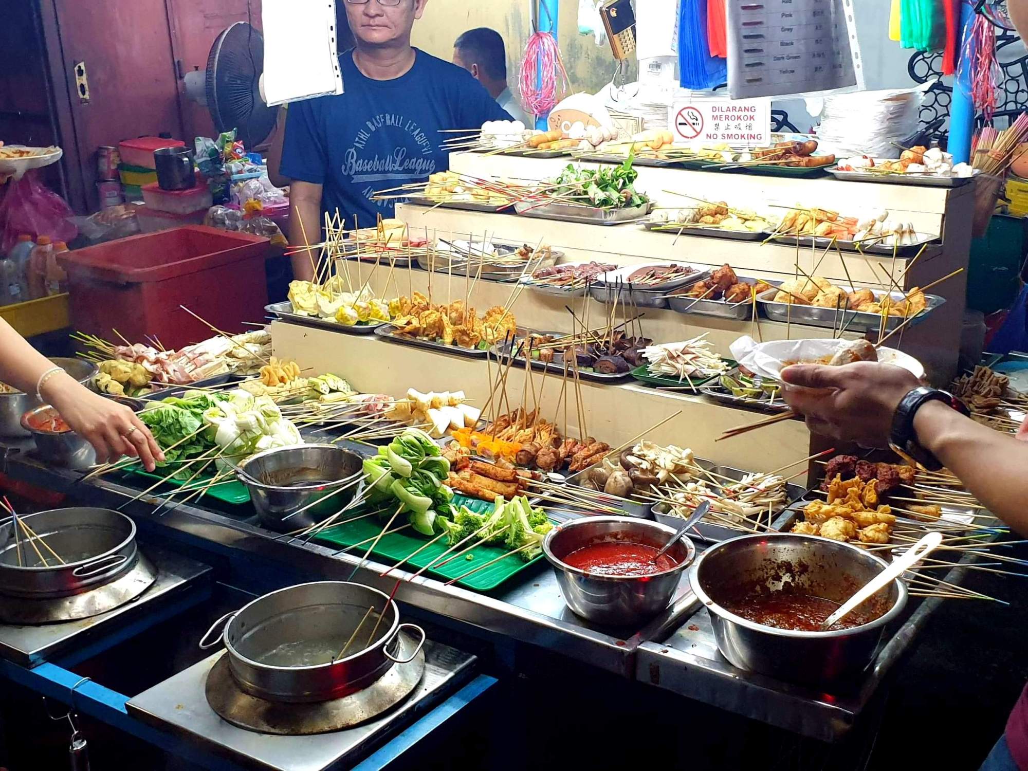 Bij aankomst maakte ik kennis met Lok-Lok: een eetkraampje aan de kant van de straat met allerlei groenten, vis en vlees aan satéstokjes. Je pakt wat je wilt, stopt het in kokend water en haalt het er uit als je denkt dat het goed is. Sausje kiezen en smikkelen maar. Als je genoeg hebt gesnackt of gegeten, geef je de satéstokjes aan de eigenaar die a.d.h.v. kleurcodes de prijs berekent. Wat een uitvinding!